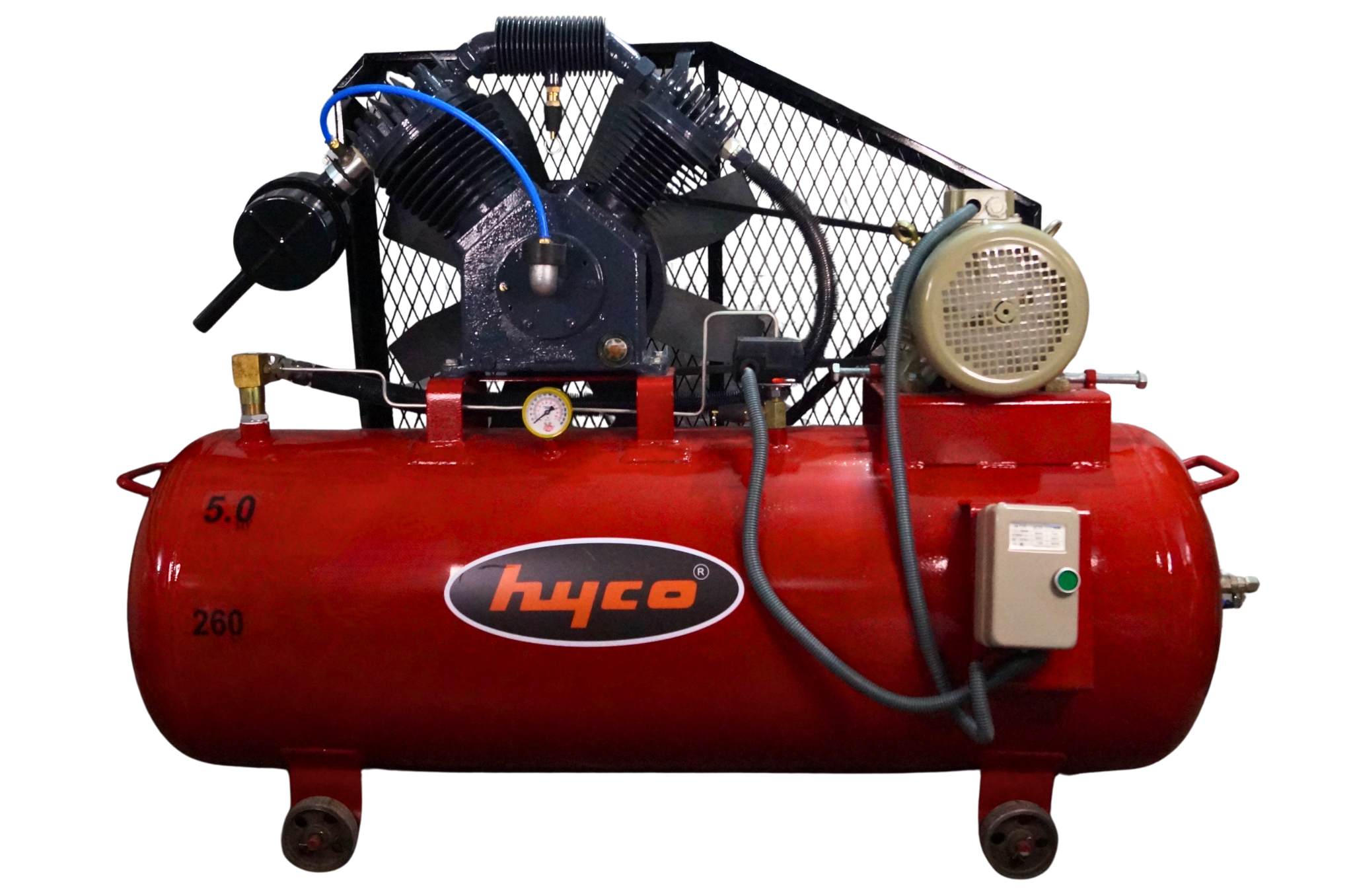 HYCO 5HP Belt Driven Lubricated Air Compressor with Three Phase CROMPTON Motor, 260L Tank Capacity, 100% Copper Winding