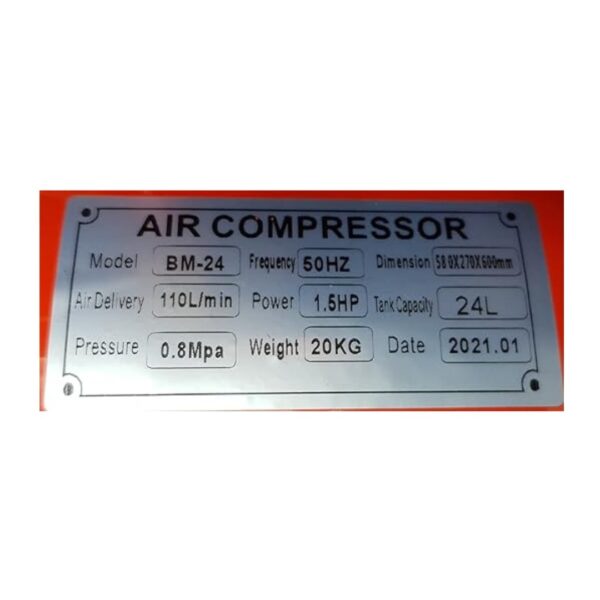 - Power : 3 HP, Cylinder : 48X1 mm, Speed : 2800 r/min, Pressure : 8 Bar, Weight : 30 Kg, Color – Orange