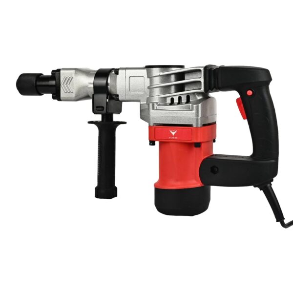 This robust HYCO LABEL FLYMAX Demolition Hammer is a powerhouse of construction equipment, featuring an impressive 1800W motor that delivers exceptional breaking power. The 7kg unit operates at 4380 RPM, making quick work of tough demolition tasks. The ergonomic design includes a shock-absorbing handle that reduces vibration and user fatigue during extended operation. This Taiwan-made tool comes complete with chisels and a durable carrying case for convenient storage and transport. The 37mm capacity makes it suitable for various heavy-duty applications. The tool’s red and black professional design combines durability with functionality, while its comfortable grip ensures precise control during operation. Perfect for construction sites, renovation projects, and professional contractors who demand reliable performance and lasting durability.